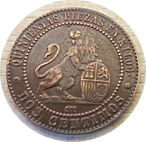 Beschriftung: DOS CENTIMOS / OM / QUINIENTAS PIEZAS EN KILOG ( = 500 Stücke dieser Münze würde 1000 Gramm ergeben – also 1 Kilo )