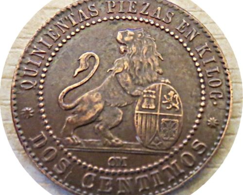 2 centimos 2 gramos 1870 Münzen Spanien Material der Münze: Kupfer, Gewicht: 2 Gramm Beschriftung: DOS CENTIMOS / OM / QUINIENTAS PIEZAS EN KILOG ( = 500 Stücke dieser Münze würde 1000 Gramm ergeben – also 1 Kilo ) 8 Meravedi 1826 Spanien Münzen Spain coins 10 Centimos 1870 … 2 centimos 2 gramos 1870 Münzen Spanien weiterlesen