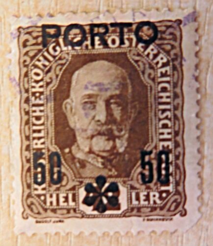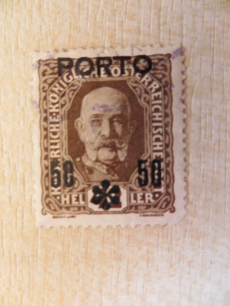 eine 42 Heller Briefmarke aus Kaisers Zeiten mit einem Portostempel von 50 Hellern –