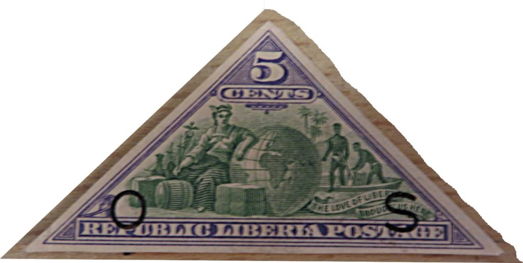 Im Jahr 1894 wurde eine dreieckige Briefmarke, sowohl ungezähnt als auch durchbohrt, sowie als regulärer und offizieller Typ (jedoch in einer anderen Farbe) herausgegeben. Dies ist die erste dreieckige Briefmarke für Liberia, gefolgt von anderen.