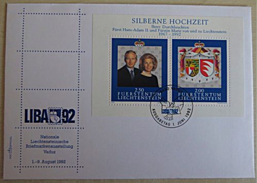 Liechtenstein silberne Hochzeit Fürst Adam II. und Fürstin Marie Ersttagsstempel 1. Juni 1992 auf Briefcouvert Wappenzeichnung – Burg Vaduz 1920 Briefmarken Liechtenstein geschnitten 1 Krone a. 15 Heller 1920 Kaiserkopf – Liechtenstein Briefmarken Portomarken Schweiz 1879 – Switzerland – Postage-due stamps Flugpost Schweiz – 1923 – … Liechtenstein silberne Hochzeit Fürst Adam II. und Fürstin Marie weiterlesen