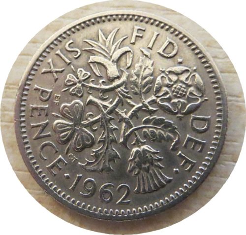 Eine SIXPENCE Münze aus England gilt in britischen Ländern als Glücksbringer – wegen dem Kleeblatt (2 Kleeblätter) auf der Münze.