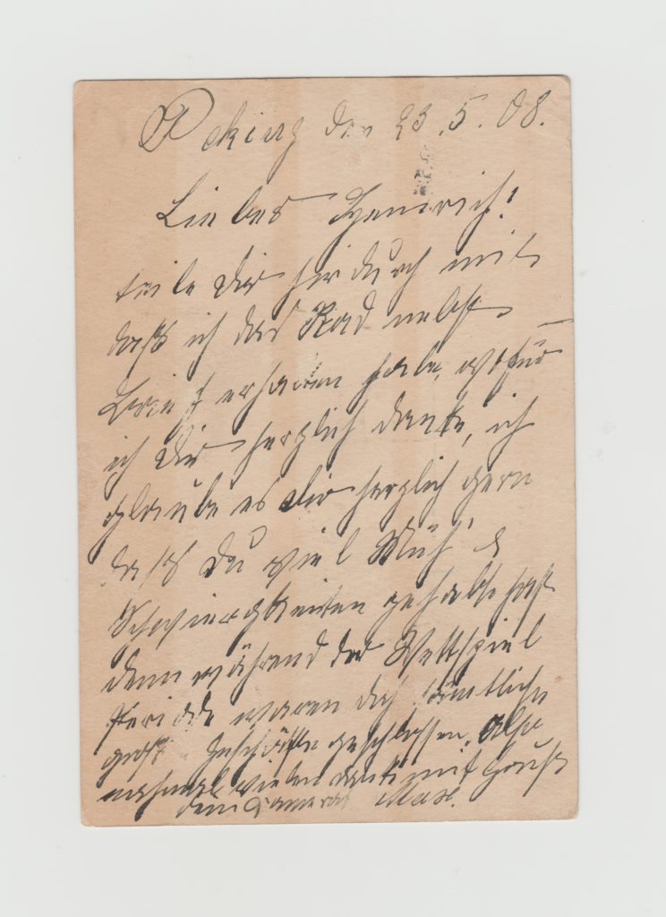 Diese Postkarte – eigentlich eine Ganzsache – wurde am 23.5.1908 geschrieben, am 25.5.1908 aufgegeben und abgestempelt in Peking!