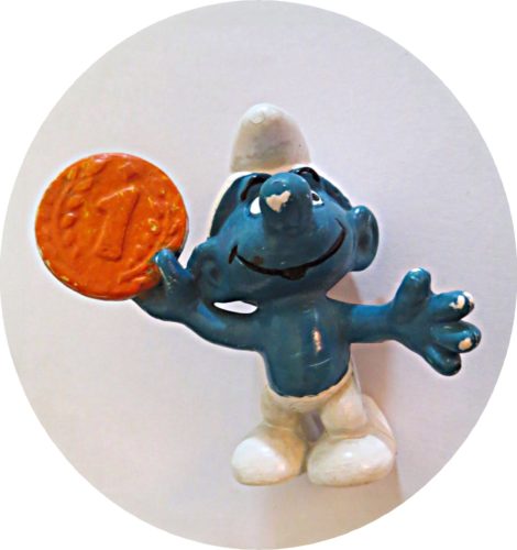 Der Schlumpf Taler zeigt auf der Vorderseite „1“-Taler und auf der Rückseite das Abbild von Papa-Schlumpf
