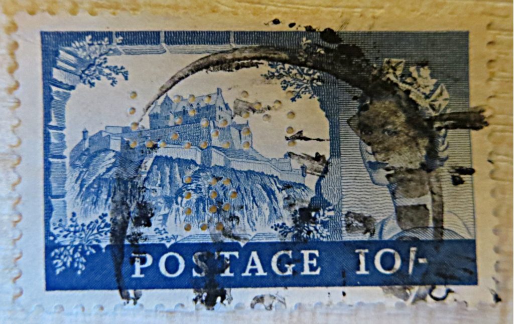 ten shilling stamp Edinburgh Castle Elizabeth II. – perfin